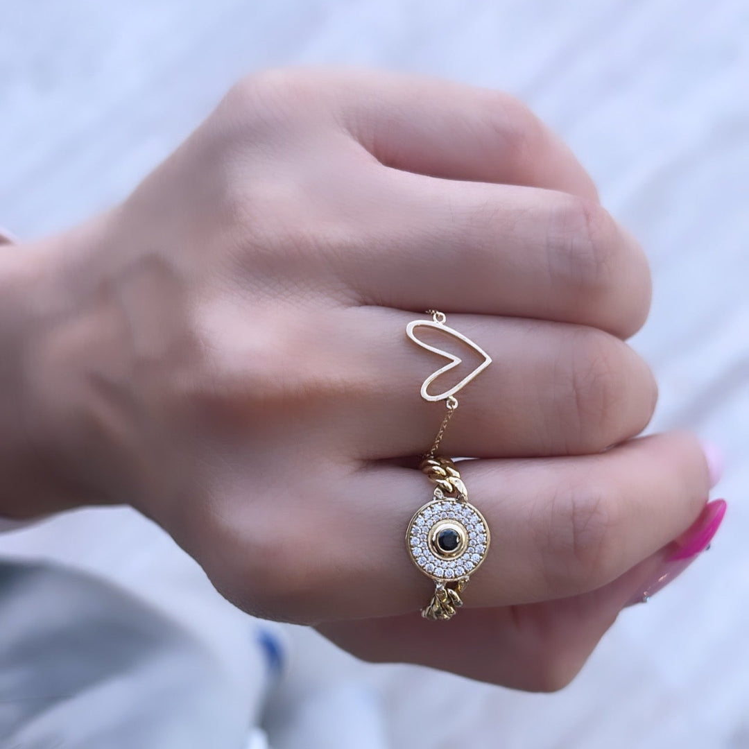 The Tilted Heart is a celebration of beautifully imperfect love—the kind that doesn't follow straight lines or perfect symmetry, yet remains unbreakable. Crafted in luxurious 18k solid gold, this enchanting chain ring features an asymmetrical open heart with a tilted silhouette that captures the authentic, wonderfully messy reality of real love and genuine connection.
