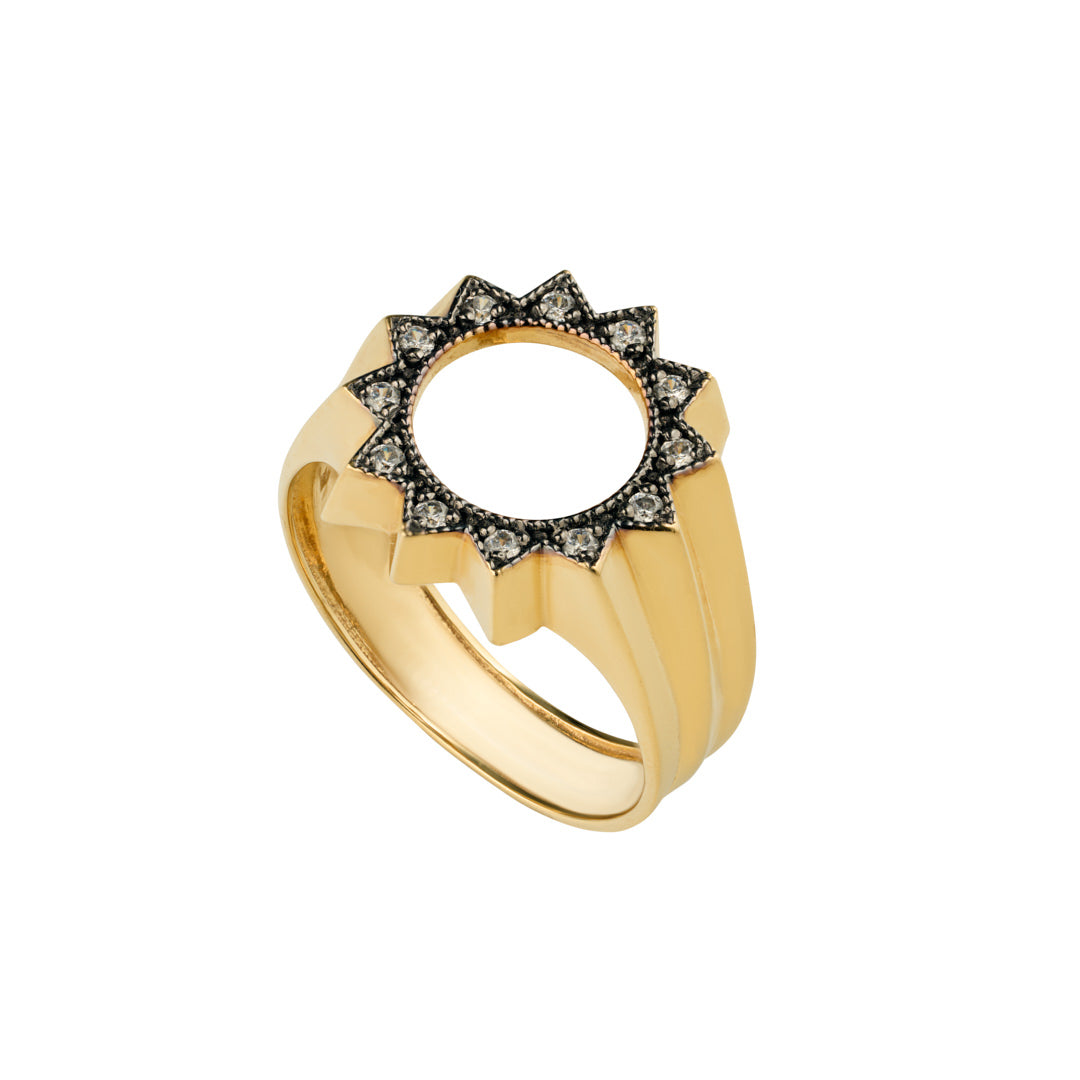 The edges are encrusted with brilliant white stones forming a starburst pattern that mirrors the black rhodium background. The open circle design represents self-discovery and endless potential, making it more than jewelry, but a declaration of inner Royalty!