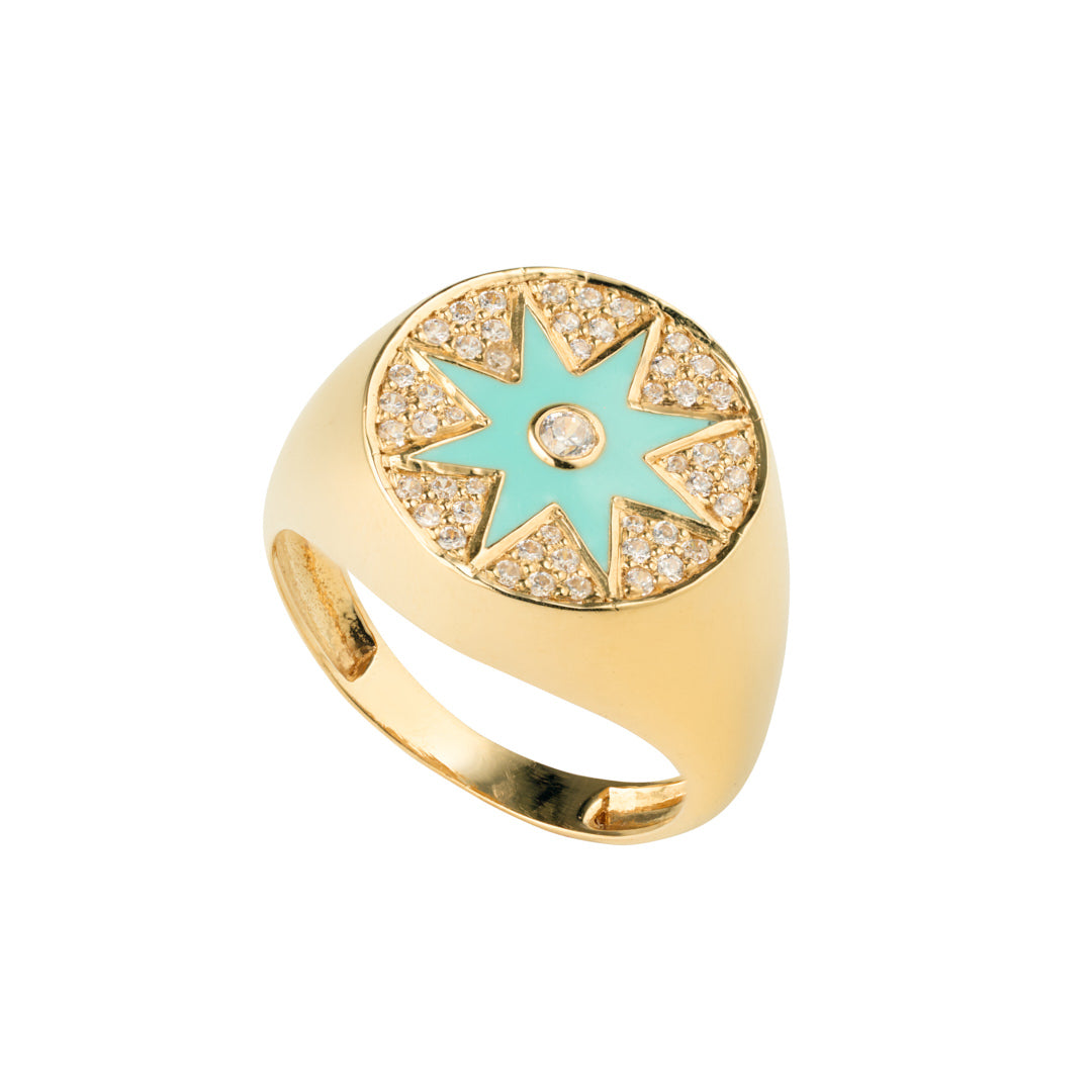 The "Cosmic Bloom" or "The Starkling" pinky ring, inspired by the radiance of a starburst. Crafted in 18k gold with turquoise enamel with a dazzling pave stone setting.