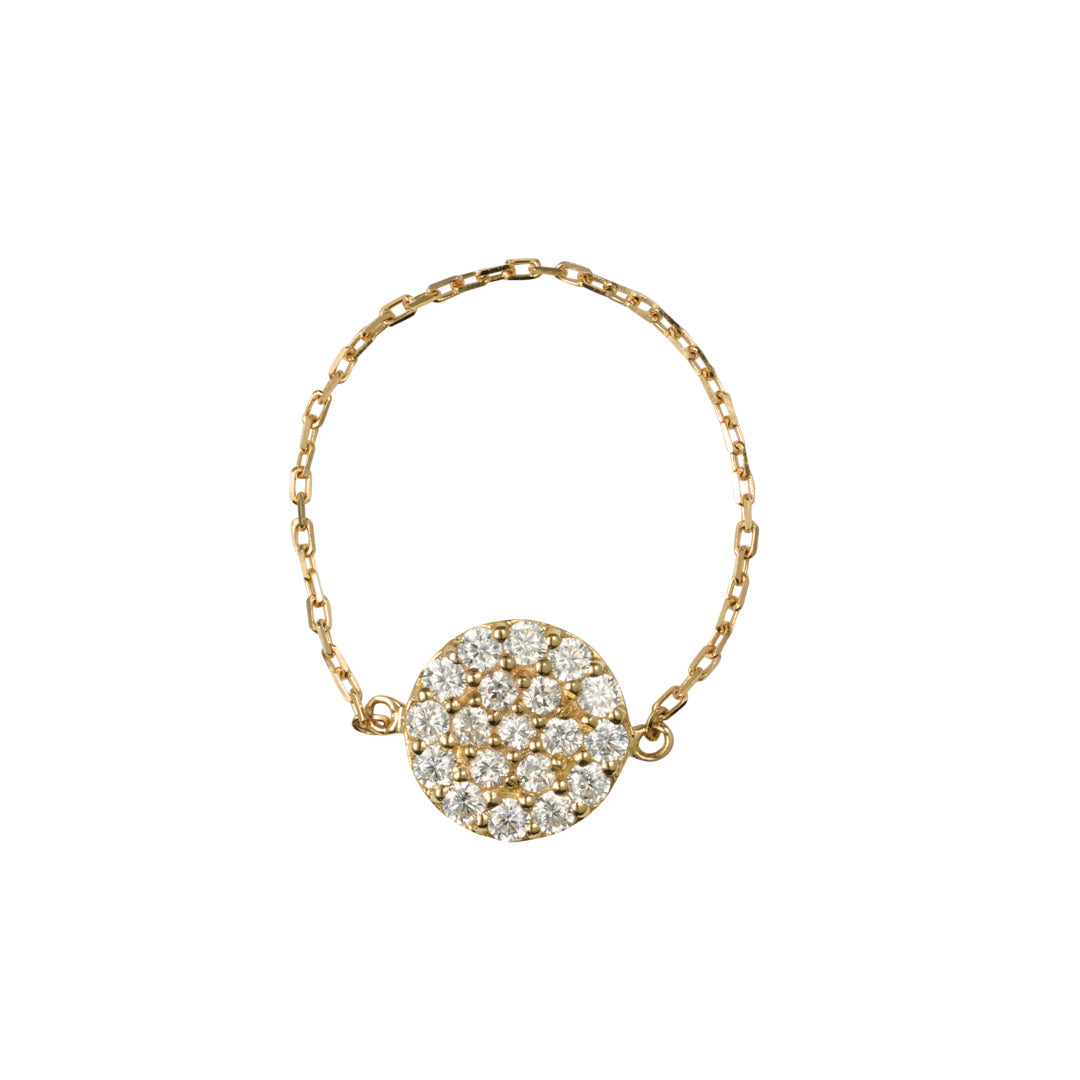 It embodies the eternal brilliance of the night sky, captured in a circle of shimmering light. Crafted in 18k solid gold with a radiant round medallion paved with clustered white stones; arranged to reflect the glowing fullness of the moon at its brightest phase.