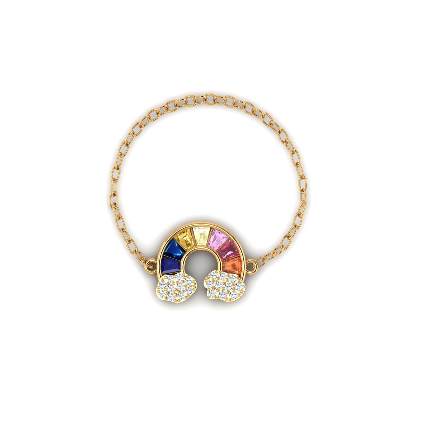 The Rainbow Promise is a joyful celebration of hope, optimism, and the magic that happens after the storm. Crafted in luxurious 18k solid gold, this enchanting chain ring features a vibrant rainbow arc adorned with brilliant gemstones in every color of the spectrum—sapphire blue, emerald green, sunny yellow, coral orange, passionate pink, and regal purple—all resting on two fluffy pavé clouds that sparkle like morning dew.